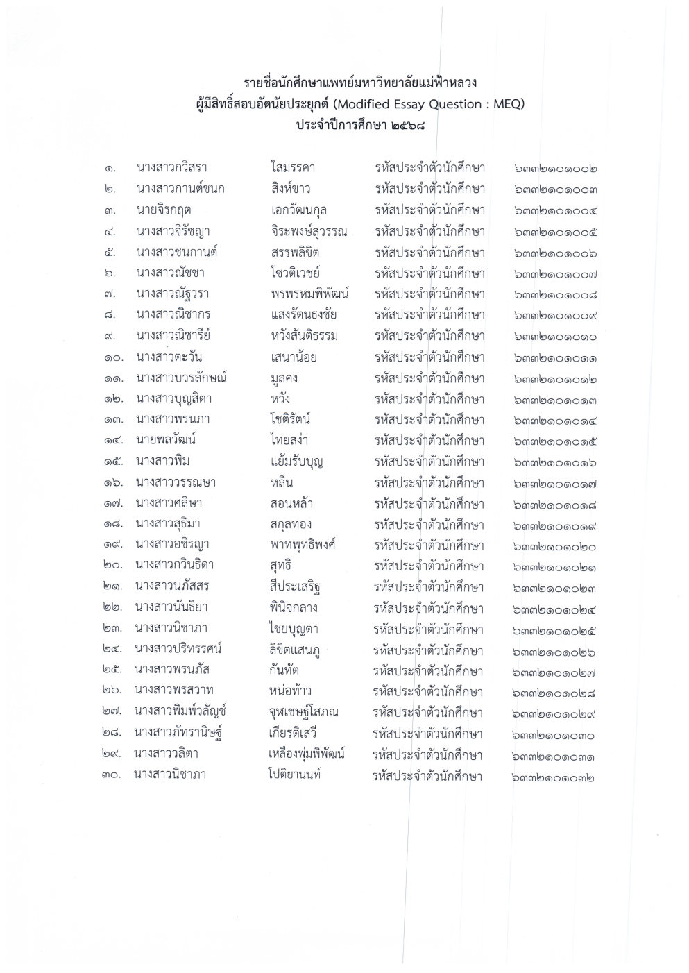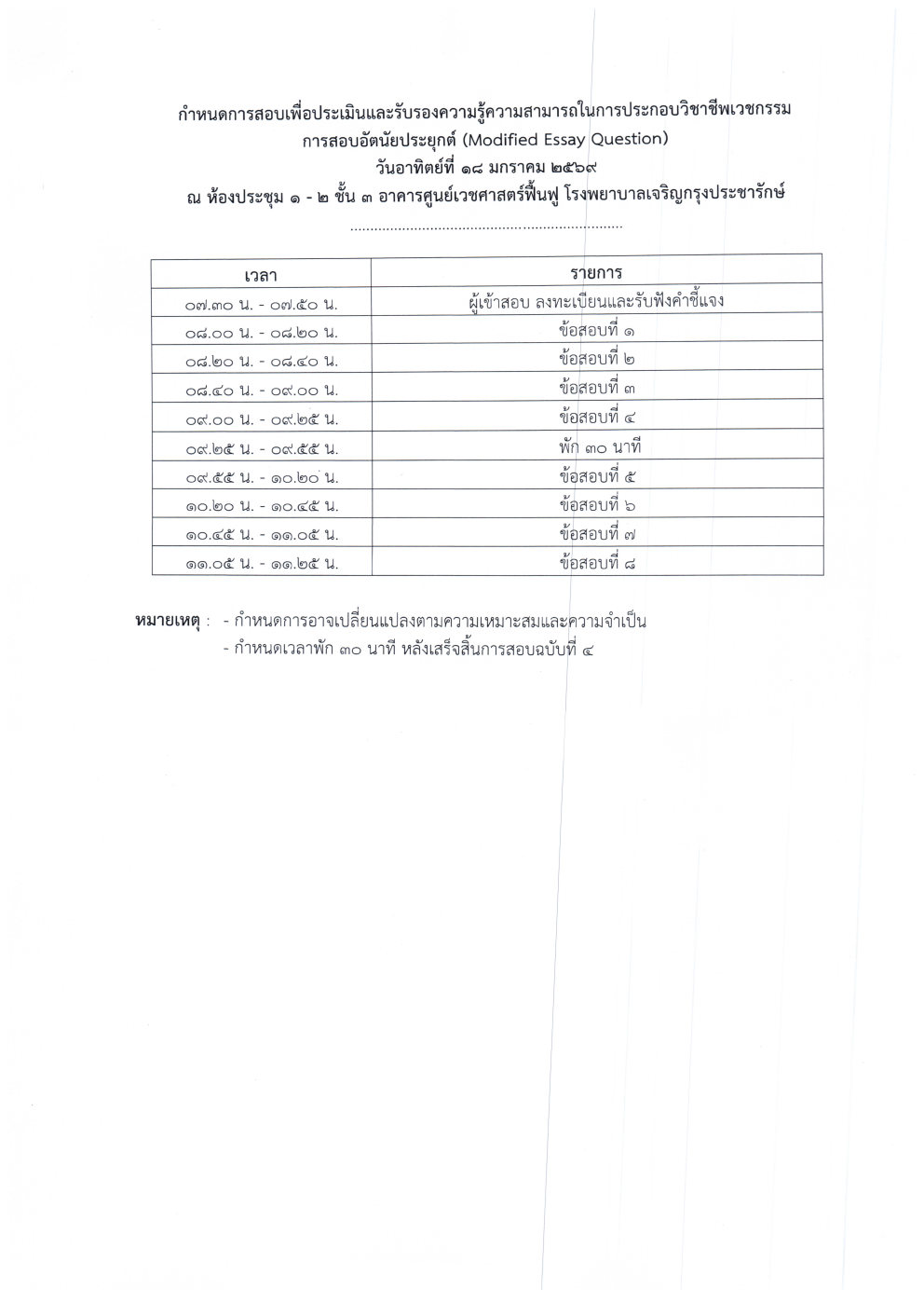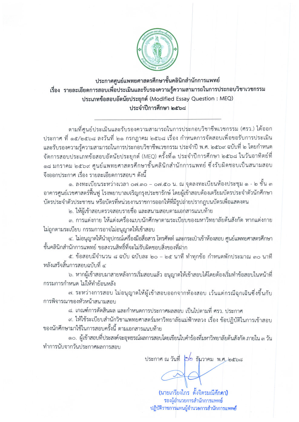 รายละเอียดการสอบเพื่อประเมินและรับรองความรู้ความสามารถในการประกอบวิชาเวชกรรมประเภทข้อสอบอัตนัยประยุกต์ (Modified Essay Question : MEQ)ประจำปีการศึกษา ๒๕๖๘